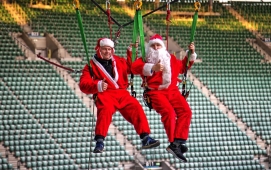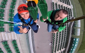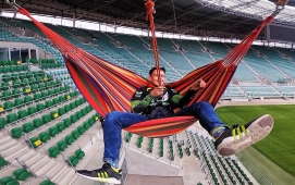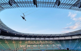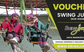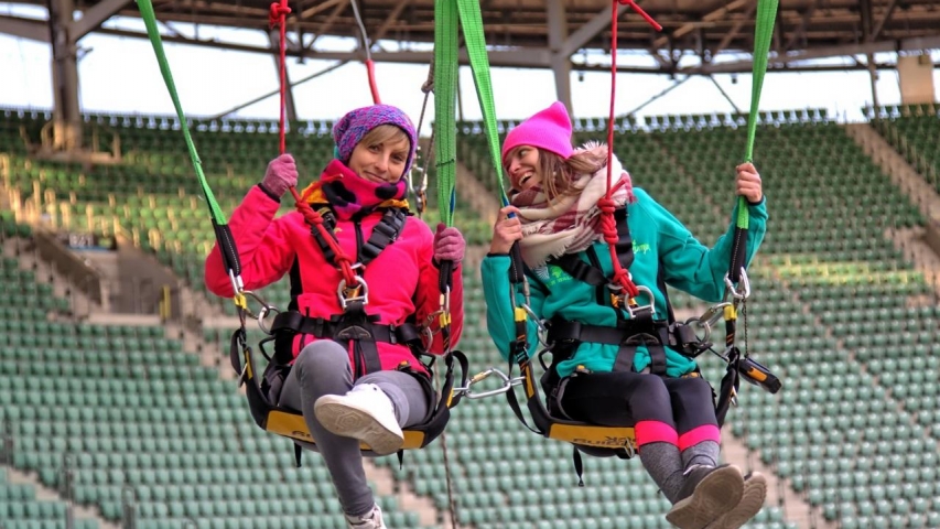 Swing Jump - czyli skok wahadłowy. Jest to nasza trzecia ekstremalna atrakcja na Stadionie we Wrocławiu związana z linami :) Od pozostałych atrakcji wyróżnia ją to, że ze skoku mogą w tym samym czasie skorzystać nawet dwie osoby - to pierwsze takie tandemowe skoki na linach w Polsce! Od teraz możecie wspólnie przeżywać te ekstremalne emocje - trzymając się za ręce i drąc się wniebogłosy ;-) Skok wahadłowy cechuje się ogromnym przyspieszeniem już od pierwszej chwili wyczepienia z układu, ale emocje dawkowane są od początku, gdzie skoczkowie podciągani są, aż pod sam dach stadionu.. kiedy po chwili niepewności, zadumy i błogiej ciszy, bez odliczania.. zostają nagle wyczepieni z układu, spadając z niesamowitym przyspieszeniem i po chwili szybują tuż nad krzesłami trybun!