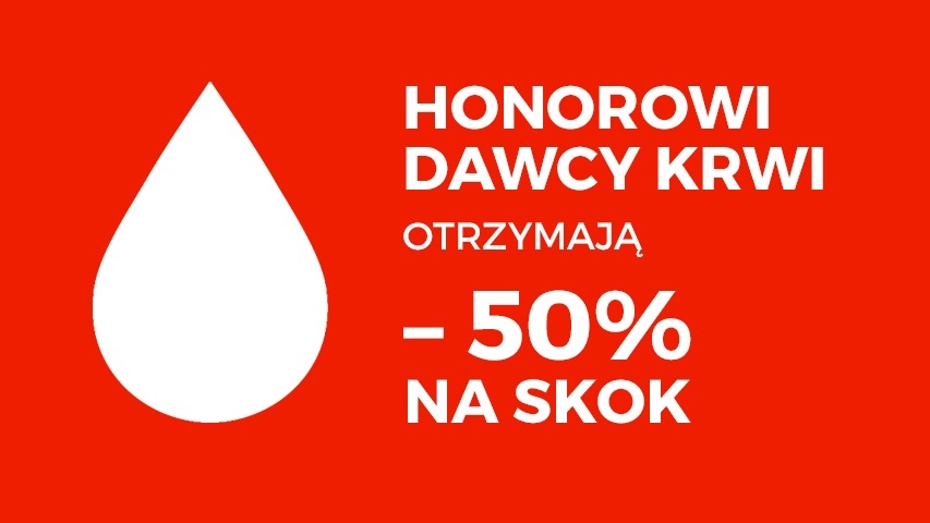 Od dzisiaj HDK dostaje 50% zniżki czyli skok za 60 zł. Promocja jest dla aktywnych, honorowych dawców krwi(takich, u których od ostatniego pobrania nie minął więcej niż rok). Każdy kto zakupi taki skok w promocji dla HDK przy wizycie u nas i okazaniu legitymacji dawcy krwi dostanie specjalną zniżkę na skok oraz zostanie obsłużony poza kolejnością!